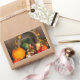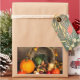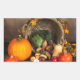 Stickers avec la photo d'une récolte d'action de grâce, posés sur une table en bois rustique. Citrouille, pommes de terre, courge etc... composent cette belle collection de nourriture. Des feuilles d'automne colorées entourent le panier de la cornucopie.