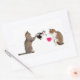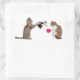 Portrait de deux chats face à face, l'un soulevé sur ses pattes arrières en se déversant avec soin d'une théière en céramique de chats en une tasse rose tenue par la seconde, pendant qu'ils apprécient leur thé