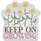 This sticker features a charming retro aesthetic inspired by 1970s groovy art, showcasing whimsical daisies with cheerful smiley faces and organic, flowing stems. The "Keep On Growing" typography uses a bold, wavy serif font in earthy brown and soft pink tones that perfectly complement the vintage-inspired nature theme. It is designed for students, office workers, business owners, plant lovers, and anyone who appreciates a "cottagecore" or "vibe-check" aesthetic. This versatile decal is perfect for personalizing water bottles, laptops, journals, or phone cases, adding a touch of botanical positivity and nostalgic flair to your daily essentials.