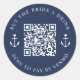 Procurez des boissons gratuites à la mariée lors de sa soirée ou son week-end de bachelorette avec ces autocollants de code QR personnalisés en bleu marine et blanc. Le design comprend deux lignes de texte personnalisé (représenté par "payez un verre à la mariée" et "scan pour payer avec Venmo") en lettrage blanc, avec un code QR personnalisable au centre, rehaussé de deux illustrations d'ancres de navire surmontées de cœurs. Ajoutez le lien vers votre service ou application de paiement préféré, et le code QR sera mis à jour afin que les participants à la fête (ou les admirateurs) puissent scanner pour payer !