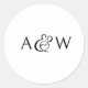 Stickers Arrondi Monogramme Mariage noir et blanc Ampersand. Un design magnifique avec des initiales de couple avec un ampersand décoratif avec un accent de coeur d'amour. Montré en noir sur blanc ivoire classique. Convient aux mariages de toute saison, fiançailles, anniversaires etc.. Customisez avec vos initiales de duogrammes. Nous vous invitations à visiter notre magasin Zazzle, Austen & Grace, pour voir la suite de faire-part de mariage complète ainsi que des cadeaux, décoration maison, et plus encore.