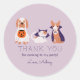 Sympa Halloween thème fête d'anniversaire préfèrent autocollant pour les enfants avec l'adorable illustration de deux chiens et d'un chat en costumes (chauve-souris, fantôme, et vampire) sur un arrière - plan violet. Customisez ce produit en ajoutant le nom de l'enfant. Parfait pour une fête d'anniversaire de fille en automne. Le texte dit "Merci d'être venu à ma fête !"