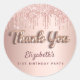 Un autocollant pour une fête d'anniversaire girly et glamour de 21e (ou tout âge). Un faux rose or à l'apparence métallique arrière - plan avec un élégant faux rose or et parties scintillant rose gouttes, look goutte à goutte de peinture. Le texte : Merci est écrit avec une police de style bulle. Personnalisez et ajoutez un nom et 21 ans. Le nom est écrit avec un script de style moderne écrit à la main.