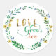 Aquarelle dessinée à la main avec la marguerite jaune et de minuscules fleurs et feuilles bleus, avec le message "L'amour pousse ici" parfait pour les autocollants de produit, les autocollants de faveur de mariage, les autocollants de douche nuptiale, les autocollants de faire-part de grossesse, les autocollants d'anniversaire de naissance