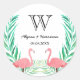 Autocollant mariage rond, parfait comme des scellés d'enveloppe, avec flamants d'aquarelle et feuilles de palme. Personnalisez avec votre initiale bientôt partagée, vos noms et votre date mariage.