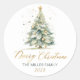 Élégant, moderne Script or Aquarelle Arbre de Noël Famille Sticker rond classique de Noël. Avec un joli script écrit à la main Calligraphie avec disant "joyeux noël", nom de famille et année. Idéal pour Noël, facile de les personnaliser avec vos noms et informations d'année.