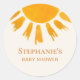 Cet autocollant de baby shower est décoré d'un soleil aquarelle jaune et d'une simple typographie sur un arrière - plan crème douce. Facile à personnaliser. Utilisez l'outil de conception pour modifier la taille, le style ou la couleur du texte. Parce que nous créons notre oeuvre, vous ne trouverez pas cette image exacte d'autres designers. Aquarelle originale © Michele Davies.