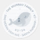 Joli autocollant d'adresse de retour en forme d'étoile mignonne baleine nouveau-née avec nom et adresse personnalisés modernes bleu poussiéreux sur un fond rayé bleu pastel. Cet autocollant d'adresse rond et mignon est parfait pour envoyer des faire-part de naissance ou des invitations à une fête de bébé. Découvrez plus de modèles de design inspirés de l'océan pour bébés et enfants avec des créatures marines, décoration de nurserie côtière et idées de cadeaux pour nouveau-né réalisés avec une douce brise marine par © y.BEE SEA #zazzlemade #autocollantrond #fêtedebébé #baleinemignonne