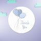 Adorable stickers Merci avec une illustration de trois ballons dans différents tons de bleu poussiéreux. Parfait pour les baby showers et les fêtes de premier anniversaire sans distinction de sexe ou de garçon. Illustré et dessiné par Patricia Alvarez.