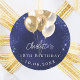 Un arrière - plan bleu marine avec d'élégants faux étincelles et des ballons d'or. La couleur bleue est inégale. Personnalisez et ajoutez un nom et un âge. Lettres blanches.