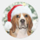 Le chien beagle porte un chapeau de Père Noël mais cela ne le met pas dans l'esprit de Noël tout à fait amoureux de les chiens autocollant de Noël