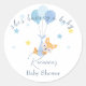 Cet autocollant de baby shower présente un doux thème de renard mignon dans les tons bleus. Un bébé renard dort et est porté par des ballons et entouré d'étoiles.