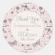 Cet adorable et féminin autocollant rond de Merci présente un motif d'insecte dessiné à la main dans des roses rousses et des verts sauge. Les insectes comprennent la libellule, le papillon, la coccinelle, l'abeille, la chenille et le ver. L'expression manuscrite "Sweet Little Critter" est éparpillée dans tout le motif ainsi que dans de minuscules coeurs roses. Le nom, l'événement et la date peuvent être modifiés. Parfait pour décorer sacs de faveur et ballotins pour Baby showers, Bébé Anniversaire...