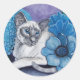 Peinture originale à l'aquarelle de Sandra Gale, représentant un chat siamois à point bleu, entouré de fleurs bleues sur un arrière - plan violet pâle. Les fleurs sont des hydrangées bleues, et des pavots bleus. Grand design pour les amoureux de les chats et ceux qui aiment particulièrement la race siamoise. Parfait pour les peintures murales dans la chambre ou encadrées avec l'image correspondante. Matching aquarelle peinture d'un point de chocolat Siamese également disponible.