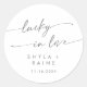 Ce boho chic gris argenté chanceux en amour favorise classique collant rond est parfait pour un mariage minimaliste. Le design moderne et bohème blanc et gris argenté blanc et fantaisiste se compose d'une calligraphie rustique simple au style unique mais classique. Personnalisez vos autocollants de faveur avec vos noms et votre date de mariage.