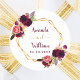 Un cadre géométrique de couleur faux or avec des roses bohème de style boho aquarellés, des fleurs en bordeaux et rose. Personnalisez et ajoutez vos noms, date du mariage.
