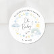 Un autocollant Whimsical pour bébé garçon avec "Oh Baby !" dans un script moderne et design et des aquarelles bleues et jaunes d'inspiration boho d'un arc-en-ciel, soleil, coeurs, étoiles, lunes et nuages. Personnalisez avec le nom de la future mère et la date de la douche dans une simple typographie.
