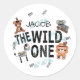 Joli boho sauvage un premier anniversaire autocollants. Conception avec des animaux sauvages de safari habillés d'éléments boho et de script "wild one" avec des lignes colorées et l'écriture ethnique. Personnalisez avec le nom de l'enfant. Parfait pour vous remercier de favoriser ou envelopper sceau.