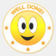 Idéal comme autocollant récompense dans les écoles, les clubs et même à la maison. Un grand visage rond heureux avec "Bien joué !" en texte jaune incurvé sur le visage heureux. Des petites étoiles jaunes au fond du visage.