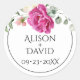 Cet élégant autocollant rond présente un superbe design floral, affichant en évidence une jolie branche d'eucalyptus ornée de délicates fleurs roses et de feuilles doux vert sauge au sommet. Les noms du couple sont élégamment présentés dans une police décorative élégante, apportant une touche personnelle au design. Autour de l'autocollant est une mince bordure subtile qui améliore son attrait général.