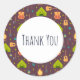 Un autocollant de remerciement conçu avec un motif de camping mignon. Camping des objets thématiques comme un feu de camp orange, une tente verte, une guitare acoustique et d'autres éléments de nature comme des arbres, des feuilles, mais aussi un sac à dos, une pelle et une cantine. motif extérieur cool.