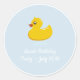 Autocollant de fête d'anniversaire de forme ronde avec un canard en caoutchouc jaune. Personnalisez-le avec les détails de la fête de votre tout-petit.Du magasin de lumirala.