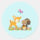Stickers avec une jolie illustration montrant un cerf de bébé et un petit écureuil tenant une glande et un papillon volant au-dessus de leur tête. Ces adorables créatures boisées se tiennent debout sur une herbe avec quelques champignons fantaisistes à leurs pieds. Arrière - plan bleu clair.