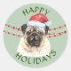 Un mignon carlin porte un casquette du Père Noël rouge devant des cordes de lumières rouges et blanches de Noël sur cet autocollant. Le texte vert personnalisé au-dessus et au-dessous de l'image dit actuellement "Joyeuses Fêtes", mais vous pouvez le modifier, si vous le souhaitez. L'image et le texte sont placés sur un arrière - plan vert clair. Parfait pour votre correspondance ou forfaits de Noël !