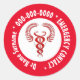 Un caducée sur un cercle blanc est bordé de rouge et a un modèle texte pour le numéro de contact d'urgence de votre médecin dans le cas où votre enfant a besoin de soins médicaux pendant son séjour à l'école. Les coller sur les boîtes à lunch, les couvertures de livres scolaires et l'équipement électronique.