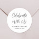Un autocollant chic pour vos invitations de mariage avec "Celebrate With Us" dans un script moderne et vos noms et date dans une typographie serif simple et élégante.