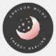 Sticker rond Classique Cosmique Classique Céleste Rose Or Crescent Lune. Cet élégant design moderne et branché présente une lune et des étoiles sur un arrière - plan noir solide. Parfait pour un guérisseur énergétique.