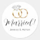 Ces autocollants personnalisés disent Marié ! avec un ensemble de bagues de mariage en diamant blanc à bandes dorées avec les noms de mariée et de mariée sur le fond. Parfait pour une fête d'après mariage !