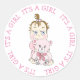 Petite fille brune mignonne tenant un ours en peluche. Baby shower rose "C'est une fille" ou autocollants faire-part de naissance.