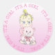 Petite fille blonde mignonne tenant un ours en peluche. Baby shower rose "C'est une fille" ou autocollants faire-part de naissance.