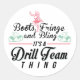 Boots, Fringe et Bling — c'est un truc de l'équipe d'exercices ! Si vous ne comprenez pas, vous n'êtes probablement pas du Texas :) Une fille de couleur corail dans un uniforme classique d'équipe de perceuse pose en haut du design en déclarant Boot, Fringe et Bling dans une police de script noir. Autour des mots 'et bling' sont une paire de poèmes de couleur menthe, avec un casquette et une botte. Les lignes de corail séparent le haut et le bas de la conception. Le fond de la conception indique que c'est un Drill Team Thing en noir avec l'ombre de menthe sur le mot Drill Team. Un design mignon et amusant pour tous les membres de votre équipe de forage!