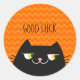 Drôle, mignon, moderne, kawaii chaton noir autocollant avec chevron orange motif et citation personnalisée humoristique : Bonne chance ! Un choix parfait pour l'anniversaire de n'importe quel amoureux des chats !