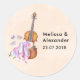 Des autocollants de mariage avec le nom de la mariée et du marié et la date mariage avec un design féminin. Illustré d'une aquarelle représentant un violon en bois, des pantoufles de ballet rose se reposent contre elle et sont décorés de fleurs et de papillons. Placez-vous sur un arrière - plan rose pêche. Personnalisez avec les noms de la mariée et du marié et la date du mariage.