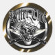 A cool sinister chef skull wearing his chef hat, in front of two sharp crossed carving knives, with metallic rimmed background. Entitled "Killer Chef," this product is a great gift for the head chef, sous chef, pastry chef, line cook, home cook, or anyone with a fierce passion for cooking. Visit www.zazzle.com/thechefshoppe and www.zazzle.com/whiskybusiness, to see more cool culinary themed skulls.