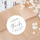 Un autocollant chic pour vos cartes de remerciement mariages et les faveurs de fête avec "Amour + Merci" dans un script moderne et une typographie élégante, vos noms et date mariage.