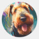 Sticker Rond Chien Airedale avec casquette d'anniversaire et ba