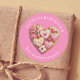 Cet autocollant de la Saint Valentin est une charmante célébration de l’amour, parfait pour personnaliser vos messages sincères. L'autocollant est rond et placé contre un arrière - plan rose doux, créant un look chaleureux et accueillant. Au centre, un coeur cuit au four composé de douceurs élaborées comme des biscuits et des bonbons attire l'attention. Chaque régal est décoré de détails délicieux tels que le givrage, les arrosages et les gouttes de chocolat, ajoutant une touche de fantaisie à la conception. Le coeur comprend également des éléments qui ressemblent à des fraises, contribuant à la variété et à l'attrait visuel. Au-dessus du coeur, l’élégante lettre blanche indique "HAPPY VALENTINE’S DAY", tandis qu’en dessous, la phrase indique la nature personnalisable de l’autocollant.