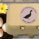 OEufs frais frais et frais de canard orange et noir étiquette moderne avec détails d'affaires. Facile à personnaliser écriture manuscrite typographie moderne en turquoise en utilisant le modèle. Illustration unique de canard aux couleurs vives, oeuvre originale unique de l'artiste Catherine Sweetman