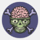 Crâne vert rétro et os croisés violets avec cerveaux roses apparents. T-shirts, sueurs, cartes, cadeaux.