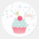 Un autocollant mignon pour les enveloppes ou les sacs de faveur de la fête comporte un cupcake rose et bleu avec une cerise sur le dessus et le coeur et confetti point.