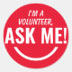 Demandez-moi des autocollants personnalisés Red Volunteer Badge avec des textes de typographie audacieux et épatants qui ressemblent à un émoticône souriant. Sourire, autocollants, autocollants ronds, aide, Bénévoles, cadeaux bénévoles, mignonette, groupe, équipage, identification, badge, dynamique, audacieuse, brillante, enfantine, enfants, s'aider les autres, demander de l'aide