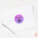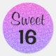 Sweet 16 autocollant rond avec une parties scintillant violette à l'ombre brillante brille arrière - plan et une écriture noire audacieuse.