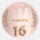 Un autocollant pour une fête de 16 ans Sweet 16, 16e anniversaire, girly et glamour. Un faux rose or à l'apparence métallique arrière - plan avec un élégant faux rose or et parties scintillant rose gouttes, look goutte à goutte de peinture. Le texte : Happy et numéro 16 est écrit avec une police de style ballon doré. Personnalisez et ajoutez un nom.