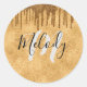 Écriture noire monogramme blanc sur sticker rond classique à goutte d'or La couleur or est la couleur de l'extravagance, richesse, richesse et excès, et partage plusieurs des mêmes attributs de la couleur jaune. La couleur or est une couleur chaude qui peut être vive et gaie ou sombre et traditionnel