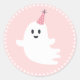 Éffrayant un Halloween mignon fantôme 1er anniversaire favoriser classique collant rond. Design moderne sur le thème de l'Halloween pour une fête éffrayante ! Cet autocollant d'anniversaire présente un heureux fantôme portant un casquette rose avec un cercle de points blancs arrière - plan rose poussiéreux.