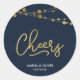 Cet élégant autocollant Cheers comporte des cordes de lumières et le mot "Cheers" en fausse feuille d'or contre un arrière - plan bleu foncé. C'est un autocollant polyvalent qui est idéal pour les mariages, fiançailles, anniversaires, anniversaires et autres célébrations. Consultez les éléments correspondants comme les invitations et les timbres ici https://www.zazzle.com/collections/strings_of_lights_faux_gold_celebration_collection-119311942951401241?rf=238364477188679314 Personnalisez-le avec vos détails en remplaçant le texte de l'espace réservé. Pour plus d'options, cliquez sur le bouton "Personnaliser". *Veuillez noter que le filigrane Zazzle qui apparaît dans l'aperçu du zoom n'apparaîtra PAS sur le produit imprimé final. © Bois de rose et agrumes